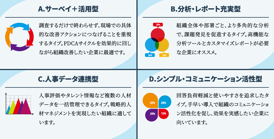 組織全体や部署ごと、より多角的な分析で、課題発見を促進するタイプ。高機能な分析ツールとカスタマイズレポートが必要な企業にオススメ。